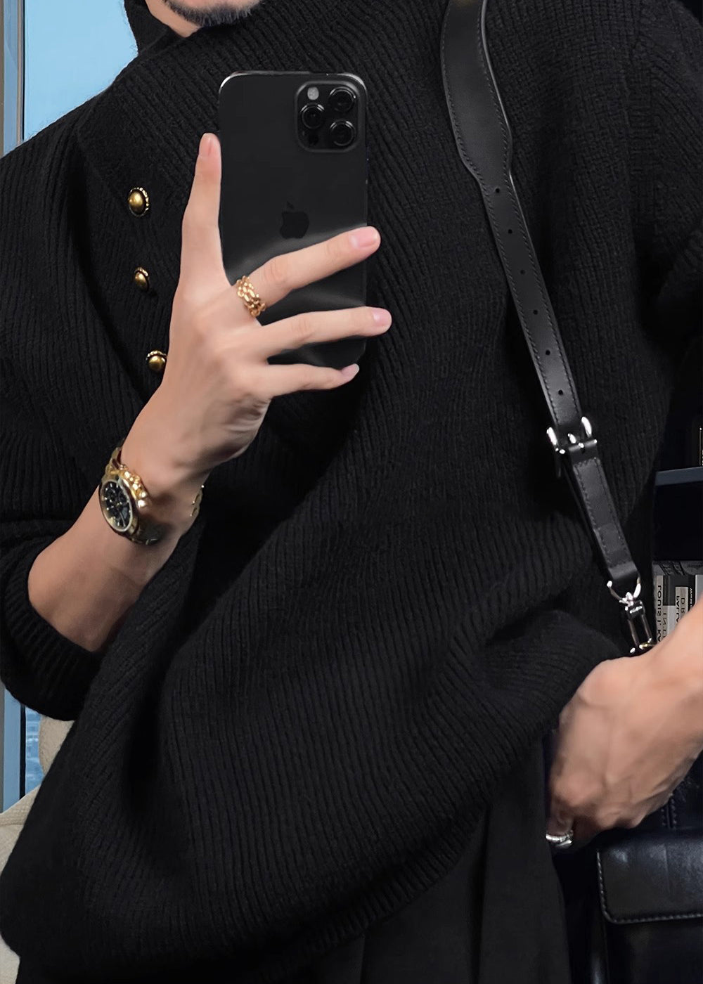 A retro-inspired heavyweight knit designed for modern comfort. This high-neck sweater combines a distinctive asymmetrical button closure with a relaxed silhouette, creating a refined yet easy-going winter essential. Crafted from dense, warm yarn with a soft hand feel, it provides excellent insulation without sacrificing breathability. The structured collar, clean rib texture, and vintage metallic buttons elevate the look, making it suitable for casual styling, daily commutes, and smart laid-back outfits. Effortlessly versatile, it pairs well with jeans, wool trousers, and winter outerwear for a sophisticated masculine style.